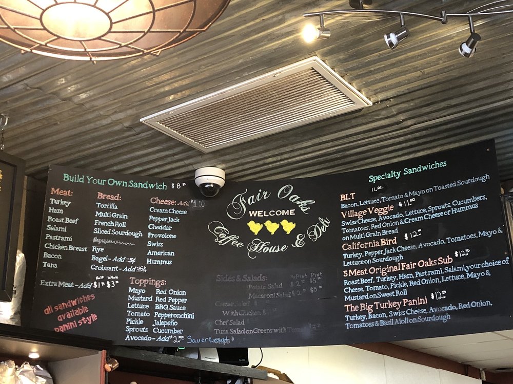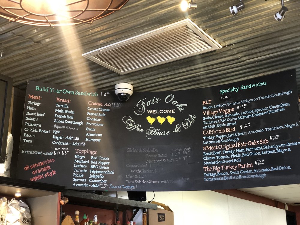 Fair Oaks Coffee House & Deli in Fair Oaks, CA offers a diverse menu with breakfast and brunch options such as Bagels, Breakfast Paninis, and Veggie Burritos. Their Specialty Sandwiches, like the California Bird and The Big Turkey Panini, are a must-try. Don't miss their delicious sides and salads, including Chef Salad and Potato Salad. The restaurant provides a casual yet classy ambiance with free Wi-Fi and outdoor seating. They also offer catering services, making it a great spot for groups and kids. The establishment is wheelchair accessible and has gender-neutral restrooms. With options for takeout, drive-thru, and even bike parking, Fair Oaks Coffee House & Deli truly has something for everyone.